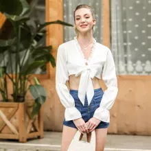 Our crop top features vintage puff long sleeves, adorned with flared elastic cuffs for a touch of elegance. The sexy deep v-neckline is accentuated by delicate ruffles, adding a playful charm to your ensemble. With its loose-fitting silhouette and cropped length, this top exudes effortless style.