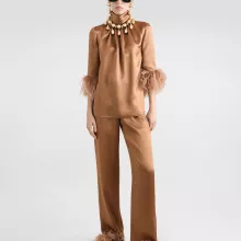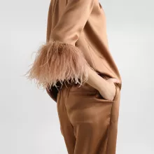 • Sleeve Detail: 3/4 sleeves with feather trim for an elegant and playful contrast.