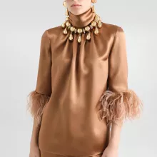 The Dolce & Gabbana Feather-Trim Blouse combines timeless sophistication with a touch of bold luxury. The feather detailing on the sleeves transforms a classic silhouette into a standout piece, making it ideal for women who want to make a refined statement. The back zipper ensures a flawless fit, while the high neck enhances the blouse’s elegant charm. This piece transitions seamlessly from formal dinners to cocktail events or even upscale daytime looks.