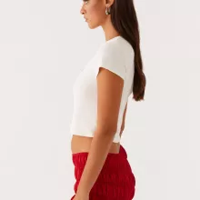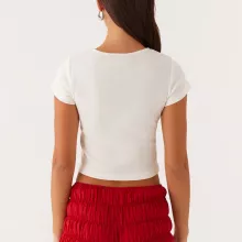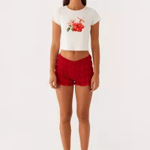 Made with a soft blend of cotton and polyester, the fabric offers a slight stretch for ease of movement and a close-to-body fit. The round neckline and short sleeves give this top a classic touch, while the cropped length adds a playful, youthful edge that pairs beautifully with high-waisted jeans, shorts, or skirts. Whether you’re heading to a summer hangout or simply want to spice up your everyday outfit, this tee delivers charm and confidence in equal measure.