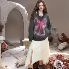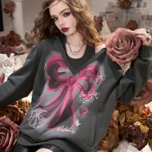 Wrap yourself in cozy sophistication with this Gray Bowknot Printed Hooded Sweatshirt. Designed with a chic American V-neck and adorned with delicate bowknot prints, this sweatshirt combines casual charm with feminine elegance. Its loose fit and mid-length cut make it the perfect go-to for layering during winter days, offering both comfort and style in one effortlessly versatile piece.