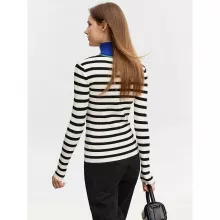 This sweater isn’t just about looking good; it’s about feeling good too. The thoughtful blend of materials, including the luxurious touch of mulberry silk and wool, ensures you stay warm and cozy throughout the colder months. The slim-fit design accentuates your curves while providing enough stretch for a comfortable fit. The timeless striped pattern and elegant embroidery make this sweater versatile enough for both casual and dressier occasions.