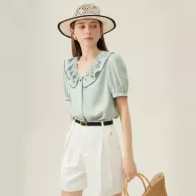 What sets our shirt apart is its seamless fusion of style and practicality. The intricate floral embroidery adds a whimsical touch, while the French lotus leaf collar exudes sophistication. Its loose fit and lightweight fabric ensure all-day comfort, making it a wardrobe staple for the modern woman.