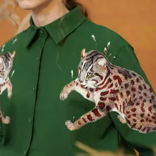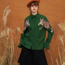 This blouse is designed to fit and flatter. With a loose, relaxed silhouette, it offers freedom of movement without compromising on style. The turn-down collar and ruffle details add a touch of vintage charm, while the classic single-breasted closure ensures easy wear. The animal-inspired leopard print jacquard pattern adds a bold statement, allowing you to express your unique style.