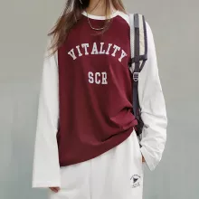 Women’s Cotton Long Sleeve T-Shirt – Burgundy Contrast Round Neck Loose Fit