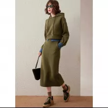 - Casual Style: Combines casual elegance with a hooded sweatshirt and a mid-calf length skirt.