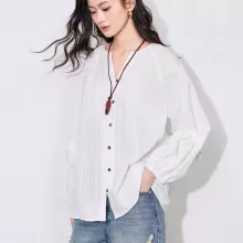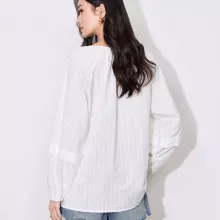 What sets this blouse apart is the delicate balance it strikes between casual and refined. The classic V-neck, along with the soft cotton fabric, offers both comfort and style, while the jacquard pattern gives it a unique, textured appeal. The lantern sleeves add a trendy twist, making it the perfect statement piece for any wardrobe. Whether you’re dressing up for a work event or down for a casual day, this blouse can be easily styled to suit your mood and occasion.