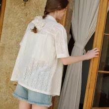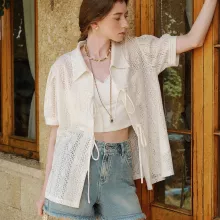 Made from a breathable blend of polyester and cotton, it offers slight stretch for ease of movement while maintaining its shape. The open-stitch front with a tie closure gives you styling versatility, and the subtle lace knit pattern elevates your outfit without overwhelming it. The V-neckline and turn-down collar give it a polished finish, while the solid color keeps things timeless and easy to pair.